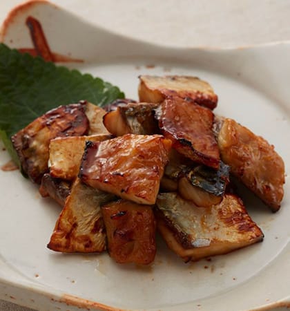 - サーモンの腹身部分を昆布醤油に漬けて焼きました。